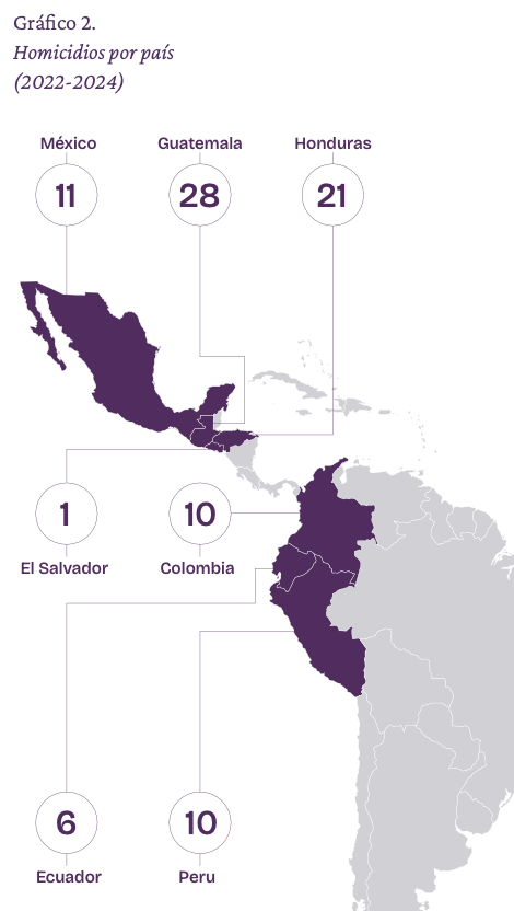 Entre 2022 y 2024, la Red Sin Violencia LGBTIQ+ documentó 87 homicidios de personas LGBTIQ+ en 7 países de Latinoamérica*, en contextos vinculados al crimen organizado, concentrados principalmente en Guatemala (28), Honduras (21) y México (11).