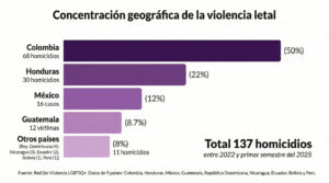 Concentración geográfica: Colombia representa el 50% de los casos documentados por la Red Sin Violencia LGBTIQ+. Le siguen Honduras (22%) y México (12%).