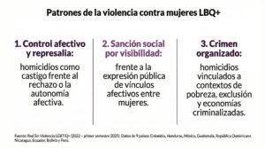 1. Control afectivo y represalia: homicidios perpetrados por hombres que mantenían o habían mantenido relaciones con las víctimas, donde la violencia opera como forma de control, castigo o represalia frente a la autonomía afectiva y al rechazo. Un caso que da cuenta de este patrón es el de Adriana, asesinada tras rechazar a su agresor, quien le advirtió que “si no era suya, no sería de nadie”, expresión que evidencia la intención de dominación.2. Sanción social por visibilidad: ataques ocurridos cuando la orientación sexual de las víctimas se hace visible, ya sea por encontrarse con sus parejas o por desenvolverse en entornos de estigmatización, en particular esto se agrava en mujeres lesbianas.