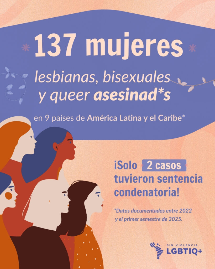 Entre 2022 y el primer semestre de 2025, la Red Sin Violencia LGBTIQ+ documentó al menos 137 homicidios de mujeres lesbianas, bisexuales y queer (LBQ+) en nueve países de América Latina y el Caribe*. Esta violencia se produce por razones vinculadas a su orientación sexual y/o a su expresión de género, y se desarrolla en contextos marcados por la discriminación, la exclusión y la falta de protección estatal.